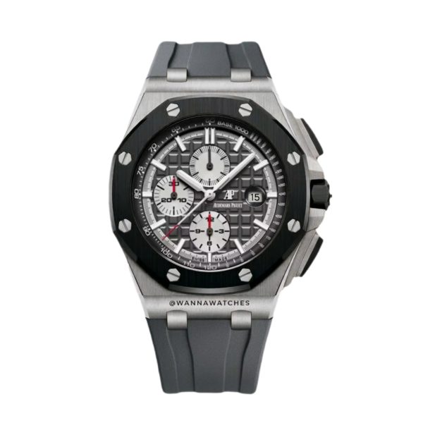 Caja: Acero inoxidable 316L de alta resistencia, 44 mm de diámetro aprox. Acabado cepillado en la superficie superior con laterales pulidos y arquitectura angular característica del Royal Oak Offshore.
