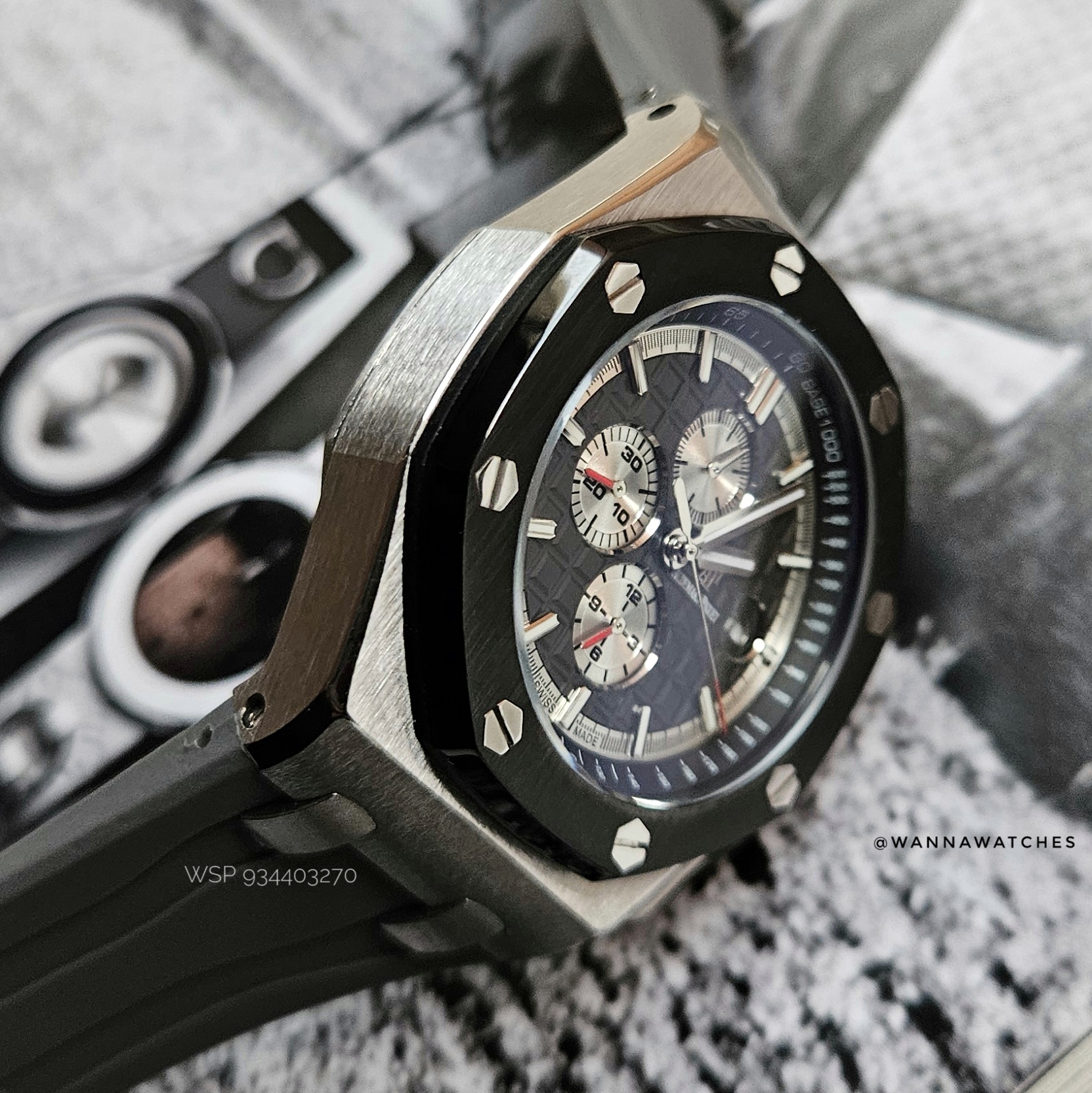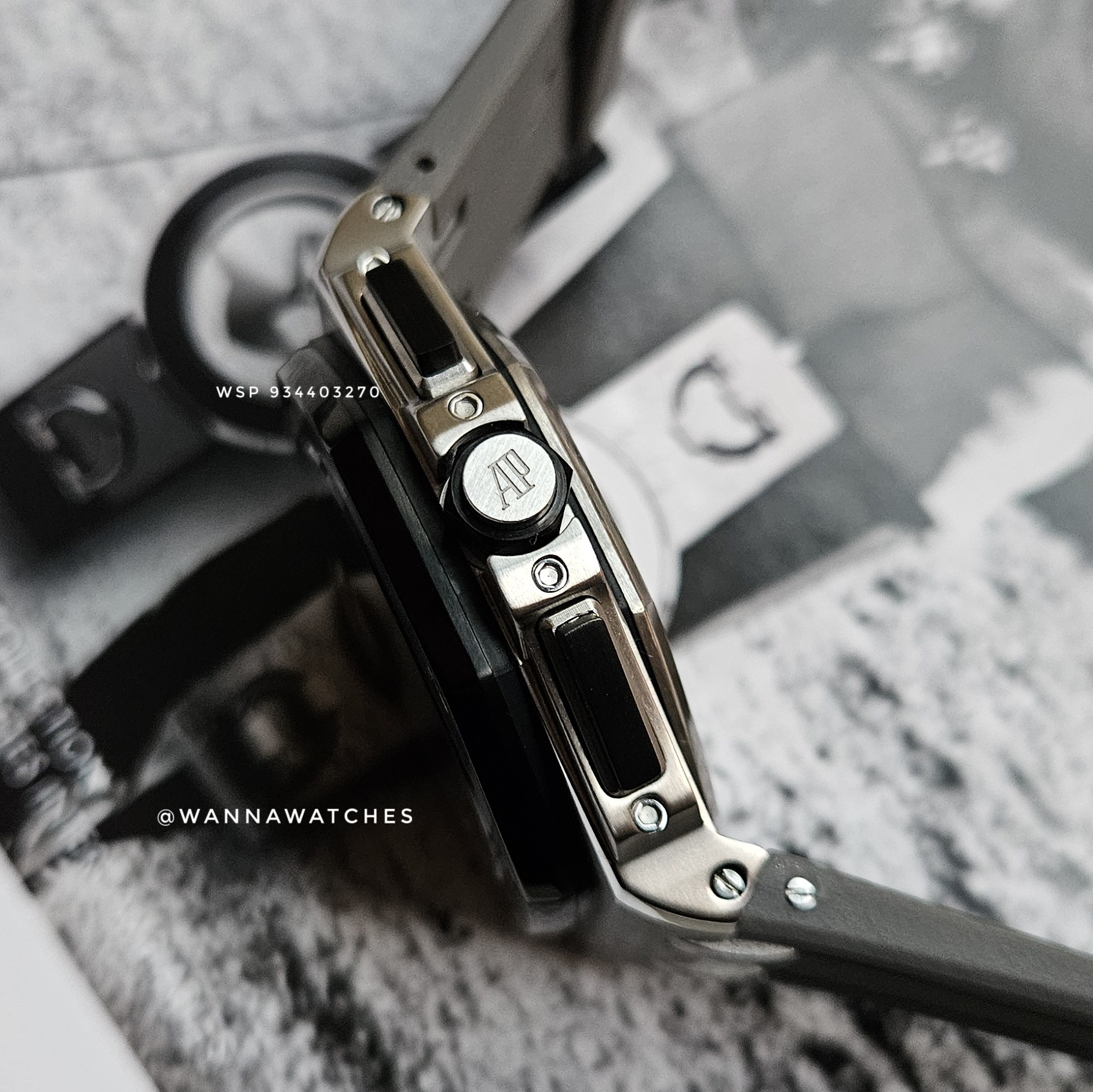 Caja: Acero inoxidable 316L de alta resistencia, 44 mm de diámetro aprox. Acabado cepillado en la superficie superior con laterales pulidos y arquitectura angular característica del Royal Oak Offshore.