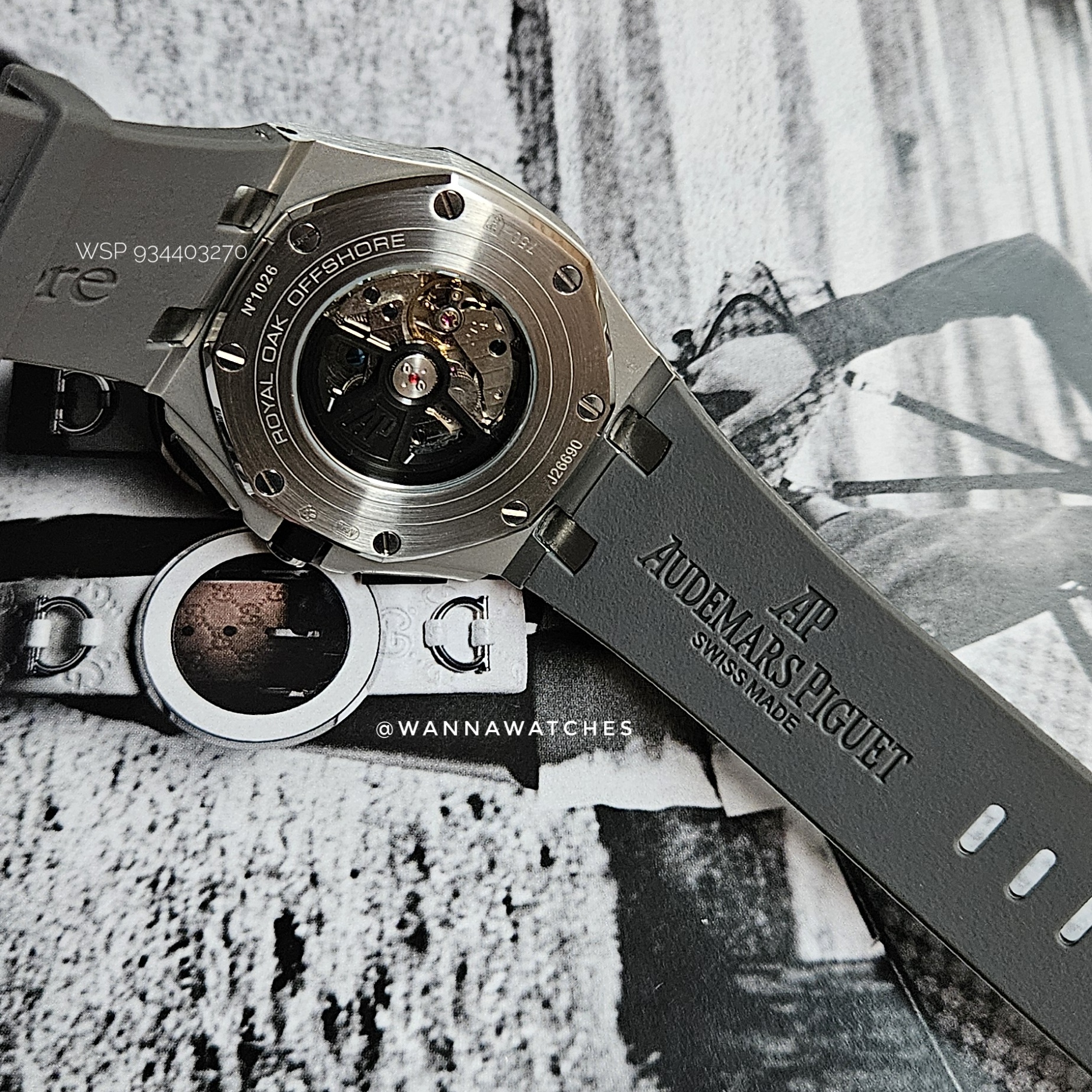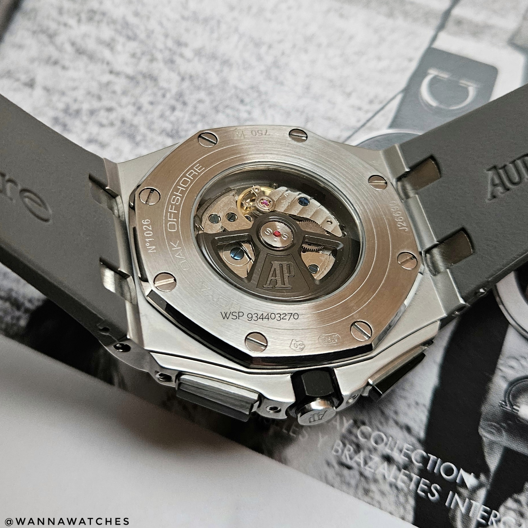 Fondo (tapa trasera): Cristal transparente tipo exhibición que permite observar el movimiento automático y rotor decorado. Aro de acero grabado Royal Oak Offshore.
