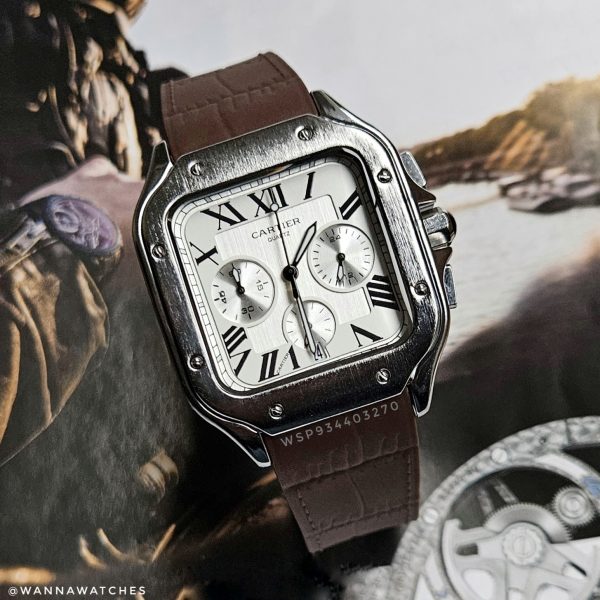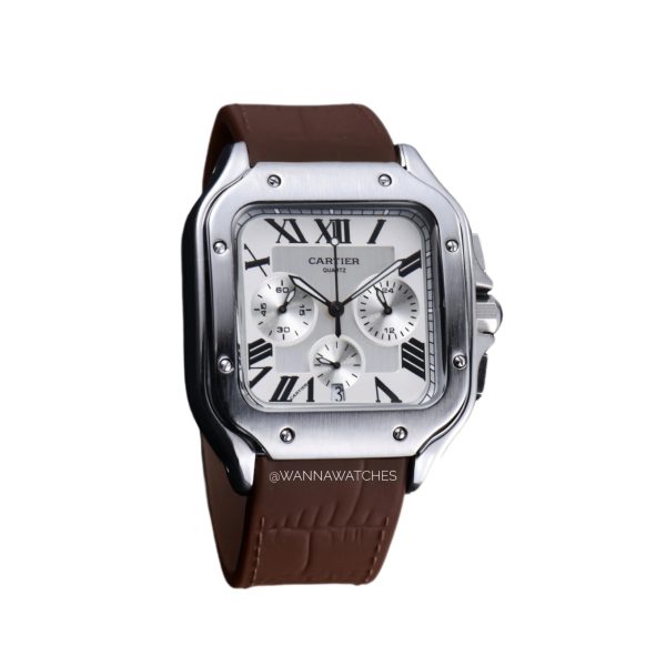 Cartier Santos 40 Cronógrafo Plateado Esfera Blanca Correa Caucho Marron