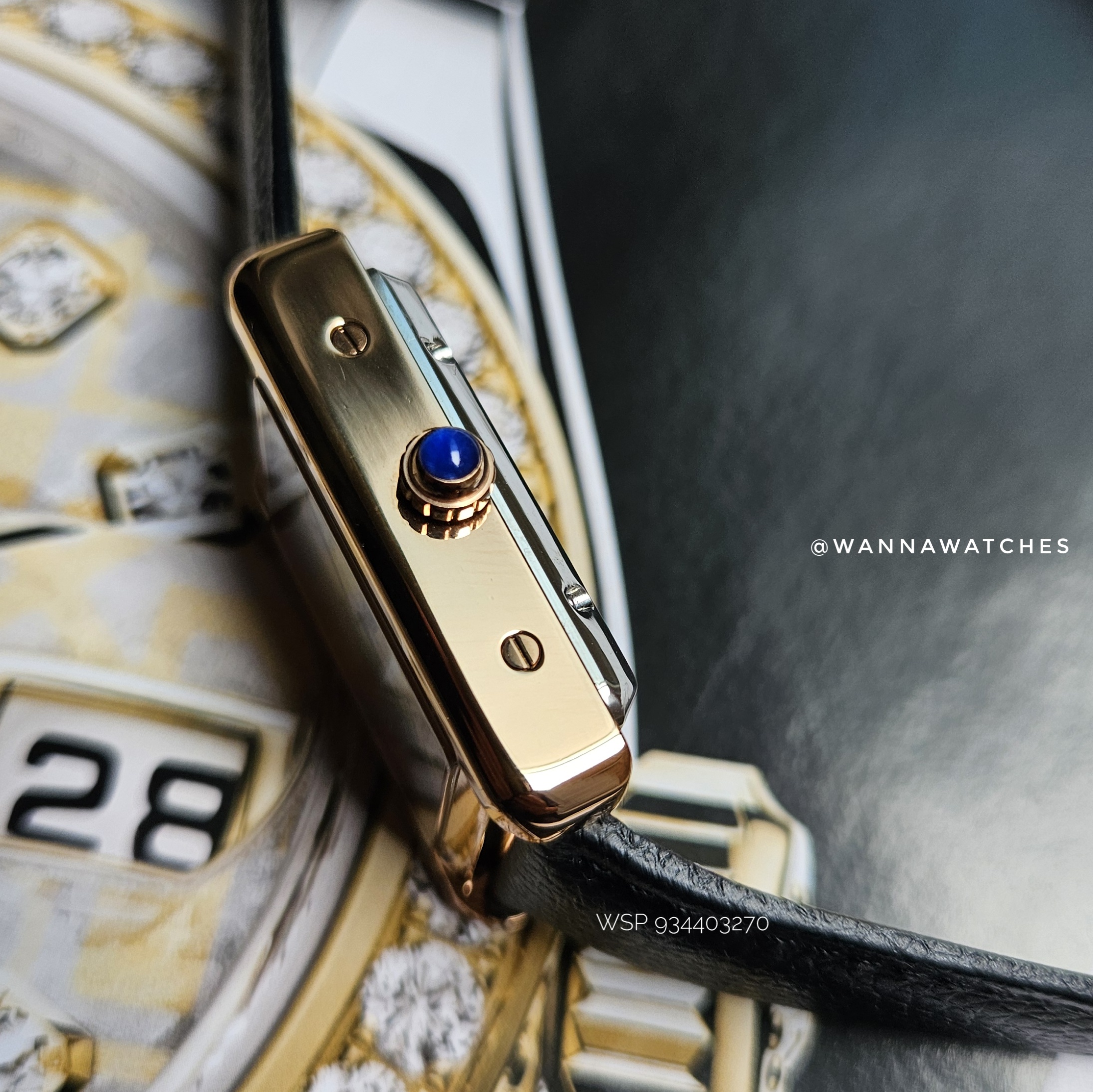Caja: Acero inoxidable 316L en tono oro rosa, con medidas de la caja: 31 mm de ancho, 41 mm de largo (lug to lug) y 12 mm de grosor. Superficie pulida espejo en laterales y bisel, bordes suavizados y asas integradas de 23 mm de encaje.