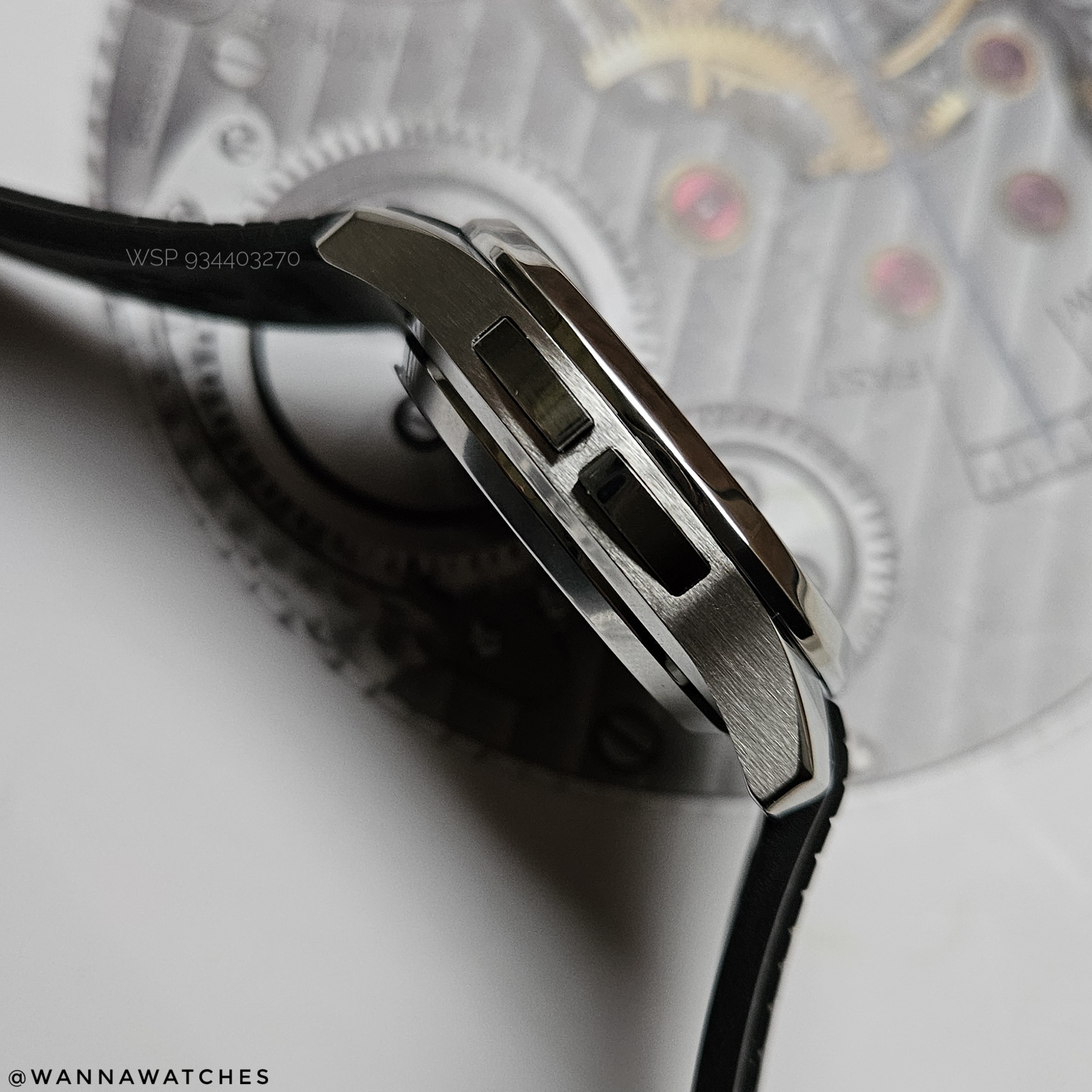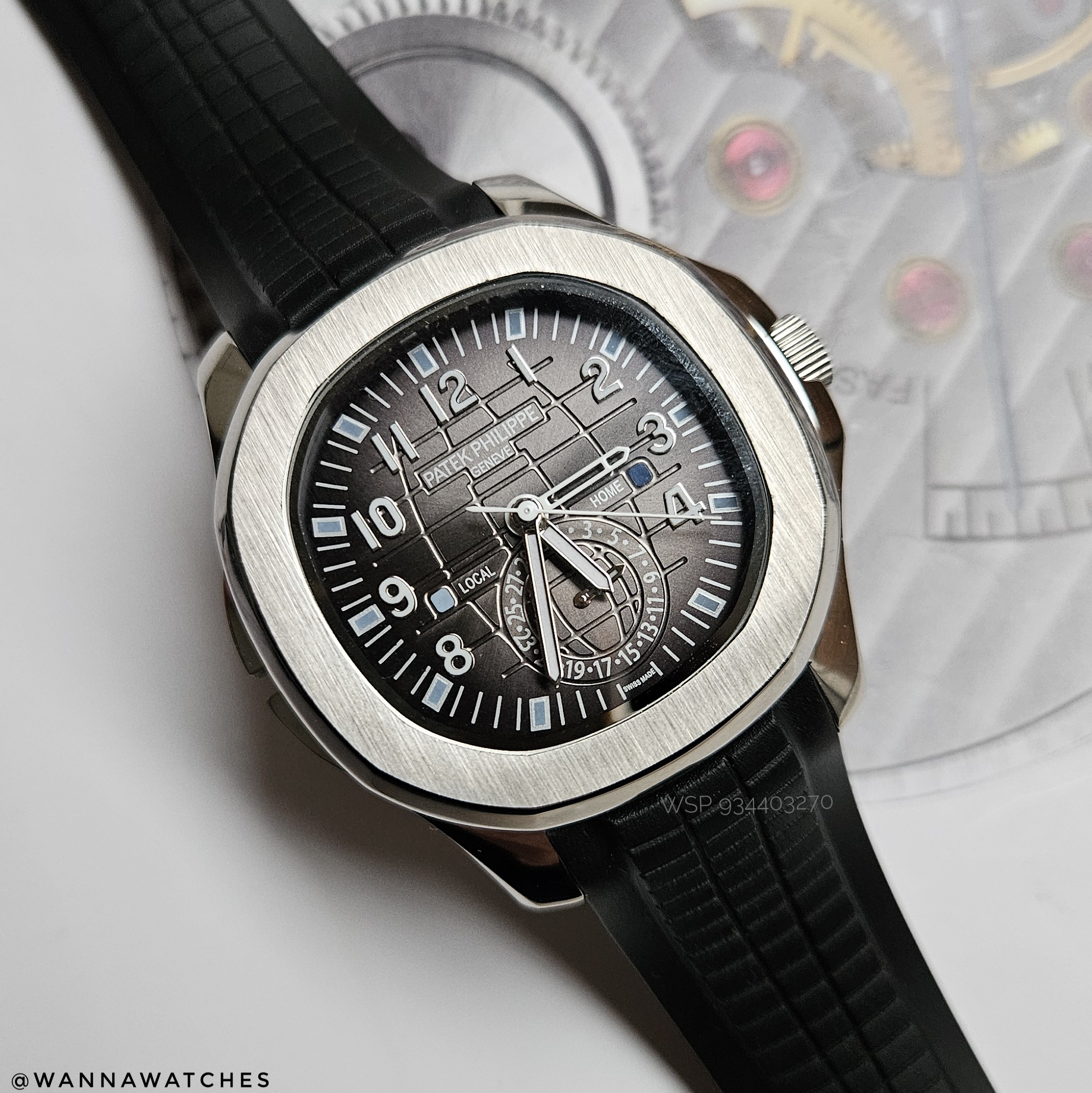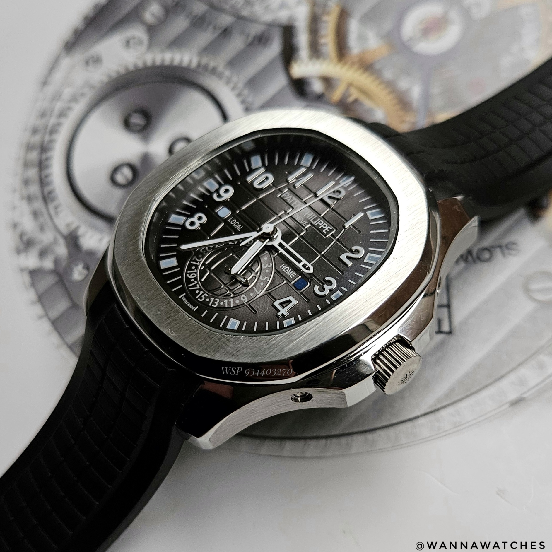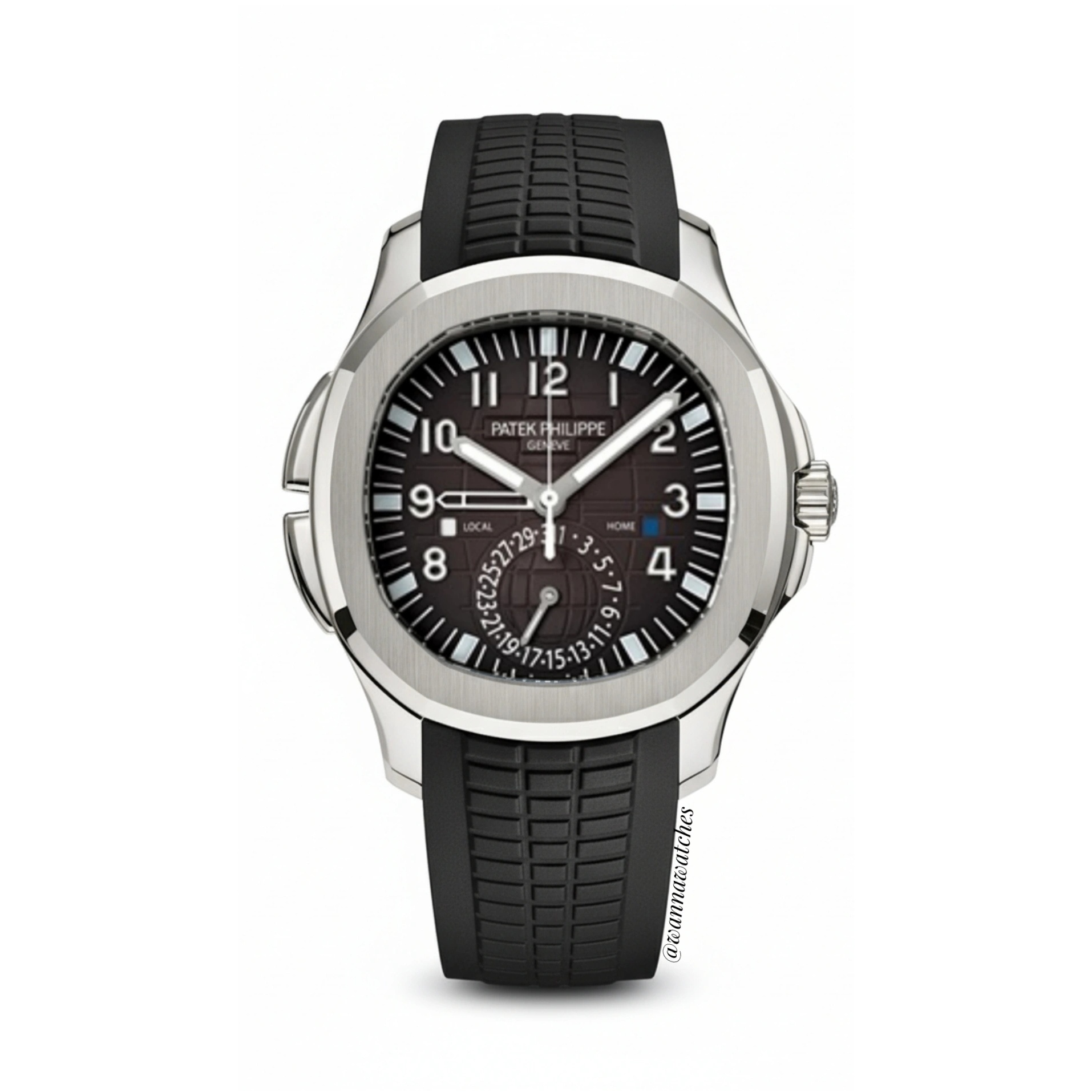 Inspirado en el célebre Aquanaut Travel Time 5164A, este modelo combina deportividad, elegancia y estilo contemporáneo. Su diseño moderno, con caja de acero pulido y correa de caucho negra, ofrece una presencia sólida y versátil, ideal tanto para uso diario como para ocasiones especiales.